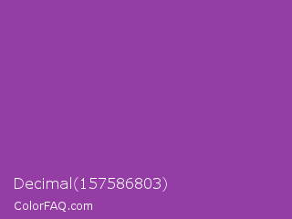 Decimal 157586803 Color is a normal purple color and the nearest color is Purpureus #9a4eae. Hex code #933da5 and RGB value is rgb(147,61,165). In RGB color space, this color is composed of 58% red, 24% green, 65% blue, In CMYK color space, this color is composed of 11% cyan, 63% magenta, 0% yellow , 35% black , In HSL color space, this color has a hue angle of 290° , 46% saturation and 44% lightness.