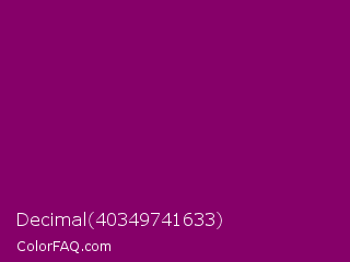 Decimal 40349741633 Color is a dark magenta color and the nearest color is Cardinal Pink #8c055e. Hex code #860069 and RGB value is rgb(134,0,105). In RGB color space, this color is composed of 53% red, 0% green, 41% blue, In CMYK color space, this color is composed of 0% cyan, 100% magenta, 22% yellow , 47% black , In HSL color space, this color has a hue angle of 313° , 100% saturation and 26% lightness.