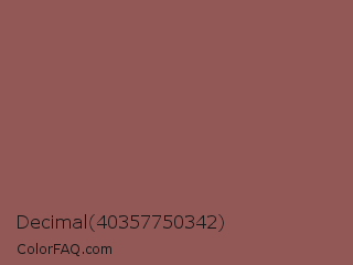 Decimal 40357750342 Color is a normal red color and the nearest color is Rose Taupe #905d5d. Hex code #915856 and RGB value is rgb(145,88,86). In RGB color space, this color is composed of 57% red, 35% green, 34% blue, In CMYK color space, this color is composed of 0% cyan, 39% magenta, 41% yellow , 43% black , In HSL color space, this color has a hue angle of 2° , 26% saturation and 45% lightness.