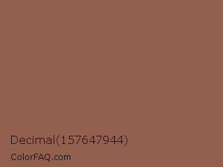Decimal 157647944 Color is a normal red color and the nearest color is Spicy Mix #8b5f4d. Hex code #936050 and RGB value is rgb(147,96,80). In RGB color space, this color is composed of 58% red, 38% green, 31% blue, In CMYK color space, this color is composed of 0% cyan, 35% magenta, 46% yellow , 42% black , In HSL color space, this color has a hue angle of 14° , 30% saturation and 45% lightness.