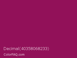 Decimal 40358068233 Color is a normal magenta color and the nearest color is Cardinal Pink #8c055e. Hex code #921159 and RGB value is rgb(146,17,89). In RGB color space, this color is composed of 57% red, 7% green, 35% blue, In CMYK color space, this color is composed of 0% cyan, 88% magenta, 39% yellow , 43% black , In HSL color space, this color has a hue angle of 327° , 79% saturation and 32% lightness.