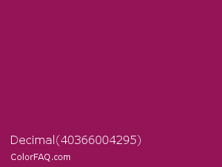 Decimal 40366004295 Color is a normal rose color and the nearest color is Disco #871550. Hex code #941457 and RGB value is rgb(148,20,87). In RGB color space, this color is composed of 58% red, 8% green, 34% blue, In CMYK color space, this color is composed of 0% cyan, 86% magenta, 41% yellow , 42% black , In HSL color space, this color has a hue angle of 329° , 76% saturation and 33% lightness.