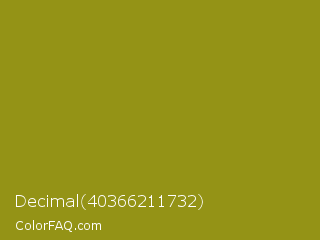 Decimal 40366211732 Color is a normal yellow color and the nearest color is Dark Yellow #9b870c. Hex code #949316 and RGB value is rgb(148,147,22). In RGB color space, this color is composed of 58% red, 58% green, 9% blue, In CMYK color space, this color is composed of 0% cyan, 1% magenta, 85% yellow , 42% black , In HSL color space, this color has a hue angle of 60° , 74% saturation and 33% lightness.