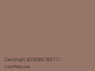 Decimal 40368678977 Color is a normal color and the nearest color is Toast #9a6e61. Hex code #987569 and RGB value is rgb(152,117,105). In RGB color space, this color is composed of 60% red, 46% green, 41% blue, In CMYK color space, this color is composed of 0% cyan, 23% magenta, 31% yellow , 40% black , In HSL color space, this color has a hue angle of 15° , 19% saturation and 50% lightness.