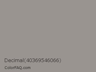 Decimal 40369546066 Color is a normal orange color and the nearest color is Mountain Mist #959396. Hex code #999490 and RGB value is rgb(153,148,144). In RGB color space, this color is composed of 60% red, 58% green, 56% blue, In CMYK color space, this color is composed of 0% cyan, 3% magenta, 6% yellow , 40% black , In HSL color space, this color has a hue angle of 27° , 4% saturation and 58% lightness.