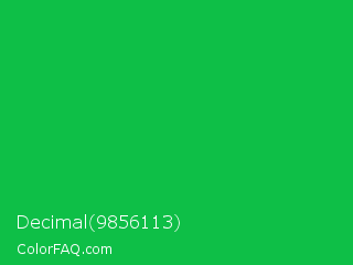 Decimal 9856113 Color is a normal green color and the nearest color is Dark Pastel Green #03c03c. Hex code #0ebf47 and RGB value is rgb(14,191,71). In RGB color space, this color is composed of 5% red, 75% green, 28% blue, In CMYK color space, this color is composed of 93% cyan, 0% magenta, 63% yellow , 25% black , In HSL color space, this color has a hue angle of 139° , 86% saturation and 40% lightness.