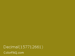 Decimal 157712661 Color is a normal yellow color and the nearest color is Hacienda #98811b. Hex code #938613 and RGB value is rgb(147,134,19). In RGB color space, this color is composed of 58% red, 53% green, 7% blue, In CMYK color space, this color is composed of 0% cyan, 9% magenta, 87% yellow , 42% black , In HSL color space, this color has a hue angle of 54° , 77% saturation and 33% lightness.