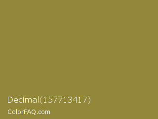 Decimal 157713417 Color is a normal yellow color and the nearest color is Sycamore #908d39. Hex code #938739 and RGB value is rgb(147,135,57). In RGB color space, this color is composed of 58% red, 53% green, 22% blue, In CMYK color space, this color is composed of 0% cyan, 8% magenta, 61% yellow , 42% black , In HSL color space, this color has a hue angle of 52° , 44% saturation and 40% lightness.