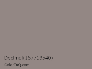 Decimal 157713540 Color is a normal red color and the nearest color is Natural Gray #8b8680. Hex code #938784 and RGB value is rgb(147,135,132). In RGB color space, this color is composed of 58% red, 53% green, 52% blue, In CMYK color space, this color is composed of 0% cyan, 8% magenta, 10% yellow , 42% black , In HSL color space, this color has a hue angle of 12° , 6% saturation and 55% lightness.
