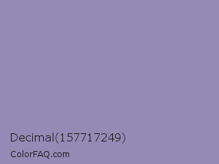 Decimal 157717249 Color is a light indigo color and the nearest color is Cool Grey #8c92ac. Hex code #938ab5 and RGB value is rgb(147,138,181). In RGB color space, this color is composed of 58% red, 54% green, 71% blue, In CMYK color space, this color is composed of 19% cyan, 24% magenta, 0% yellow , 29% black , In HSL color space, this color has a hue angle of 253° , 23% saturation and 63% lightness.