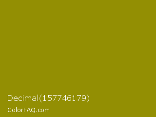 Decimal 157746179 Color is a dark yellow color and the nearest color is Dark Yellow #9b870c. Hex code #938f03 and RGB value is rgb(147,143,3). In RGB color space, this color is composed of 58% red, 56% green, 1% blue, In CMYK color space, this color is composed of 0% cyan, 3% magenta, 98% yellow , 42% black , In HSL color space, this color has a hue angle of 58° , 96% saturation and 29% lightness.