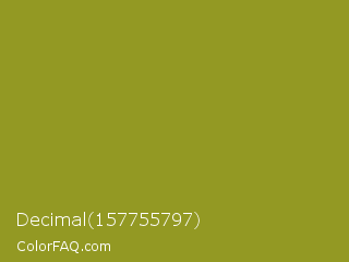 Decimal 157755797 Color is a normal yellow color and the nearest color is Citron #9fa91f. Hex code #939923 and RGB value is rgb(147,153,35). In RGB color space, this color is composed of 58% red, 60% green, 14% blue, In CMYK color space, this color is composed of 4% cyan, 0% magenta, 77% yellow , 40% black , In HSL color space, this color has a hue angle of 63° , 63% saturation and 37% lightness.
