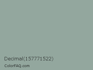 Decimal 157771522 Color is a light green color and the nearest color is Pewter #96a8a1. Hex code #93a79e and RGB value is rgb(147,167,158). In RGB color space, this color is composed of 58% red, 65% green, 62% blue, In CMYK color space, this color is composed of 12% cyan, 0% magenta, 5% yellow , 35% black , In HSL color space, this color has a hue angle of 153° , 10% saturation and 62% lightness.