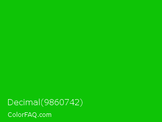 Decimal 9860742 Color is a normal green color and the nearest color is Vivid Malachite #00cc33. Hex code #0ec406 and RGB value is rgb(14,196,6). In RGB color space, this color is composed of 5% red, 77% green, 2% blue, In CMYK color space, this color is composed of 93% cyan, 0% magenta, 97% yellow , 23% black , In HSL color space, this color has a hue angle of 117° , 94% saturation and 40% lightness.