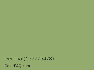 Decimal 157775478 Color is a normal green color and the nearest color is Asparagus #87a96b. Hex code #93ab6c and RGB value is rgb(147,171,108). In RGB color space, this color is composed of 58% red, 67% green, 42% blue, In CMYK color space, this color is composed of 14% cyan, 0% magenta, 37% yellow , 33% black , In HSL color space, this color has a hue angle of 83° , 27% saturation and 55% lightness.