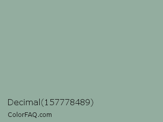 Decimal 157778489 Color is a light green color and the nearest color is Pewter #96a8a1. Hex code #93ad9f and RGB value is rgb(147,173,159). In RGB color space, this color is composed of 58% red, 68% green, 62% blue, In CMYK color space, this color is composed of 15% cyan, 0% magenta, 8% yellow , 32% black , In HSL color space, this color has a hue angle of 148° , 14% saturation and 63% lightness.
