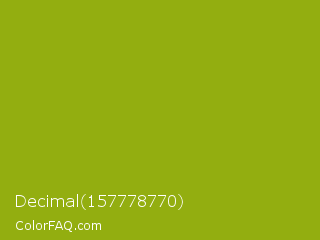 Decimal 157778770 Color is a normal yellow color and the nearest color is Apple Green #8db600. Hex code #93ae10 and RGB value is rgb(147,174,16). In RGB color space, this color is composed of 58% red, 68% green, 6% blue, In CMYK color space, this color is composed of 16% cyan, 0% magenta, 91% yellow , 32% black , In HSL color space, this color has a hue angle of 70° , 83% saturation and 37% lightness.