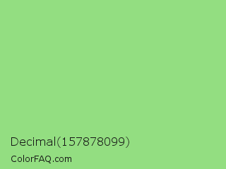 Decimal 157878099 Color is a light green color and the nearest color is Feijoa #9fdd8c. Hex code #93de81 and RGB value is rgb(147,222,129). In RGB color space, this color is composed of 58% red, 87% green, 51% blue, In CMYK color space, this color is composed of 34% cyan, 0% magenta, 42% yellow , 13% black , In HSL color space, this color has a hue angle of 108° , 58% saturation and 69% lightness.
