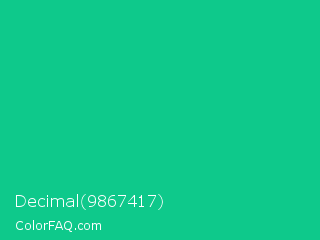 Decimal 9867417 Color is a normal green color and the nearest color is Caribbean Green #00cc99. Hex code #0ec98b and RGB value is rgb(14,201,139). In RGB color space, this color is composed of 5% red, 79% green, 55% blue, In CMYK color space, this color is composed of 93% cyan, 0% magenta, 31% yellow , 21% black , In HSL color space, this color has a hue angle of 160° , 87% saturation and 42% lightness.
