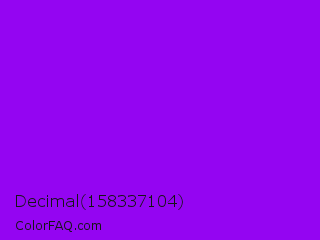 Decimal 158337104 Color is a normal purple color and the nearest color is Electric Violet #8f00ff. Hex code #9405f2 and RGB value is rgb(148,5,242). In RGB color space, this color is composed of 58% red, 2% green, 95% blue, In CMYK color space, this color is composed of 39% cyan, 98% magenta, 0% yellow , 5% black , In HSL color space, this color has a hue angle of 276° , 96% saturation and 48% lightness.