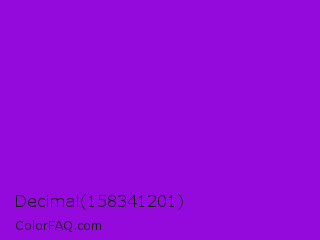 Decimal 158341201 Color is a normal purple color and the nearest color is Dark Violet #9400d3. Hex code #9409db and RGB value is rgb(148,9,219). In RGB color space, this color is composed of 58% red, 4% green, 86% blue, In CMYK color space, this color is composed of 32% cyan, 96% magenta, 0% yellow , 14% black , In HSL color space, this color has a hue angle of 280° , 92% saturation and 45% lightness.