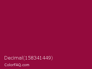 Decimal 158341449 Color is a normal rose color and the nearest color is Pink Raspberry #980036. Hex code #940a3d and RGB value is rgb(148,10,61). In RGB color space, this color is composed of 58% red, 4% green, 24% blue, In CMYK color space, this color is composed of 0% cyan, 93% magenta, 59% yellow , 42% black , In HSL color space, this color has a hue angle of 338° , 87% saturation and 31% lightness.