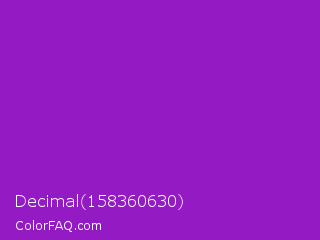 Decimal 158360630 Color is a normal purple color and the nearest color is Dark Orchid #9932cc. Hex code #941bc4 and RGB value is rgb(148,27,196). In RGB color space, this color is composed of 58% red, 11% green, 77% blue, In CMYK color space, this color is composed of 24% cyan, 86% magenta, 0% yellow , 23% black , In HSL color space, this color has a hue angle of 283° , 76% saturation and 44% lightness.