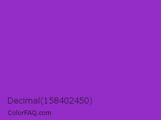 Decimal 158402450 Color is a normal purple color and the nearest color is Dark Orchid #9932cc. Hex code #942cc8 and RGB value is rgb(148,44,200). In RGB color space, this color is composed of 58% red, 17% green, 78% blue, In CMYK color space, this color is composed of 26% cyan, 78% magenta, 0% yellow , 22% black , In HSL color space, this color has a hue angle of 280° , 64% saturation and 48% lightness.