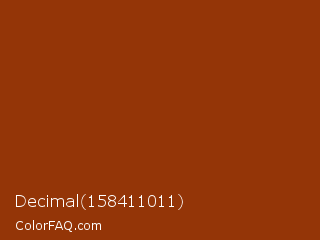 Decimal 158411011 Color is a dark orange color and the nearest color is Oregon #9b4703. Hex code #943507 and RGB value is rgb(148,53,7). In RGB color space, this color is composed of 58% red, 21% green, 3% blue, In CMYK color space, this color is composed of 0% cyan, 64% magenta, 95% yellow , 42% black , In HSL color space, this color has a hue angle of 20° , 91% saturation and 30% lightness.