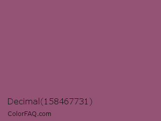 Decimal 158467731 Color is a normal rose color and the nearest color is Sugar Plum #914e75. Hex code #945375 and RGB value is rgb(148,83,117). In RGB color space, this color is composed of 58% red, 33% green, 46% blue, In CMYK color space, this color is composed of 0% cyan, 44% magenta, 21% yellow , 42% black , In HSL color space, this color has a hue angle of 329° , 28% saturation and 45% lightness.