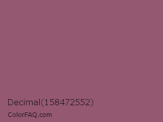 Decimal 158472552 Color is a normal rose color and the nearest color is Mauve Taupe #915f6d. Hex code #945870 and RGB value is rgb(148,88,112). In RGB color space, this color is composed of 58% red, 35% green, 44% blue, In CMYK color space, this color is composed of 0% cyan, 41% magenta, 24% yellow , 42% black , In HSL color space, this color has a hue angle of 336° , 25% saturation and 46% lightness.
