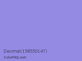 Decimal 158550147 Color is a light indigo color and the nearest color is Chetwode Blue #8581d9. Hex code #948ae3 and RGB value is rgb(148,138,227). In RGB color space, this color is composed of 58% red, 54% green, 89% blue, In CMYK color space, this color is composed of 35% cyan, 39% magenta, 0% yellow , 11% black , In HSL color space, this color has a hue angle of 247° , 61% saturation and 72% lightness.