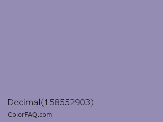 Decimal 158552903 Color is a light indigo color and the nearest color is Cool Grey #8c92ac. Hex code #948cb3 and RGB value is rgb(148,140,179). In RGB color space, this color is composed of 58% red, 55% green, 70% blue, In CMYK color space, this color is composed of 17% cyan, 22% magenta, 0% yellow , 30% black , In HSL color space, this color has a hue angle of 252° , 20% saturation and 63% lightness.
