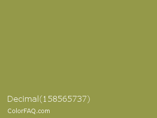 Decimal 158565737 Color is a normal yellow color and the nearest color is Sycamore #908d39. Hex code #949949 and RGB value is rgb(148,153,73). In RGB color space, this color is composed of 58% red, 60% green, 29% blue, In CMYK color space, this color is composed of 3% cyan, 0% magenta, 52% yellow , 40% black , In HSL color space, this color has a hue angle of 64° , 35% saturation and 44% lightness.