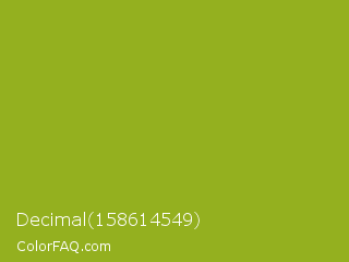 Decimal 158614549 Color is a normal lime color and the nearest color is Citron #9fa91f. Hex code #94b01f and RGB value is rgb(148,176,31). In RGB color space, this color is composed of 58% red, 69% green, 12% blue, In CMYK color space, this color is composed of 16% cyan, 0% magenta, 82% yellow , 31% black , In HSL color space, this color has a hue angle of 72° , 70% saturation and 41% lightness.