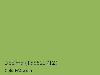 Decimal 158621712 Color is a normal green color and the nearest color is Dollar Bill #85bb65. Hex code #94b65a and RGB value is rgb(148,182,90). In RGB color space, this color is composed of 58% red, 71% green, 35% blue, In CMYK color space, this color is composed of 19% cyan, 0% magenta, 51% yellow , 29% black , In HSL color space, this color has a hue angle of 82° , 39% saturation and 53% lightness.