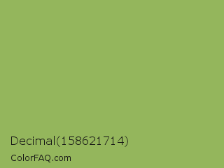 Decimal 158621714 Color is a normal green color and the nearest color is Dollar Bill #85bb65. Hex code #94b65c and RGB value is rgb(148,182,92). In RGB color space, this color is composed of 58% red, 71% green, 36% blue, In CMYK color space, this color is composed of 19% cyan, 0% magenta, 49% yellow , 29% black , In HSL color space, this color has a hue angle of 83° , 38% saturation and 54% lightness.
