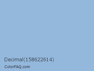 Decimal 158622614 Color is a light blue color and the nearest color is Dark Sky Blue #8cbed6. Hex code #94b7dc and RGB value is rgb(148,183,220). In RGB color space, this color is composed of 58% red, 72% green, 86% blue, In CMYK color space, this color is composed of 33% cyan, 17% magenta, 0% yellow , 14% black , In HSL color space, this color has a hue angle of 211° , 51% saturation and 72% lightness.