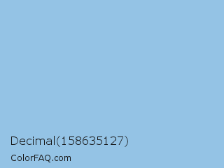 Decimal 158635127 Color is a light blue color and the nearest color is Pale Cerulean #9bc4e2. Hex code #94c3e5 and RGB value is rgb(148,195,229). In RGB color space, this color is composed of 58% red, 76% green, 90% blue, In CMYK color space, this color is composed of 35% cyan, 15% magenta, 0% yellow , 10% black , In HSL color space, this color has a hue angle of 205° , 61% saturation and 74% lightness.