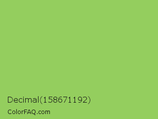 Decimal 158671192 Color is a normal green color and the nearest color is Pistachio #93c572. Hex code #94ce5e and RGB value is rgb(148,206,94). In RGB color space, this color is composed of 58% red, 81% green, 37% blue, In CMYK color space, this color is composed of 28% cyan, 0% magenta, 54% yellow , 19% black , In HSL color space, this color has a hue angle of 91° , 53% saturation and 59% lightness.
