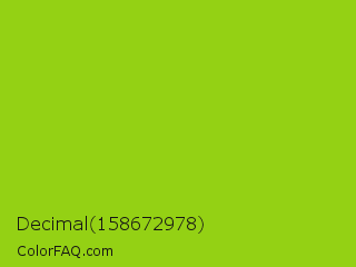 Decimal 158672978 Color is a normal lime color and the nearest color is Bahia #a5cb0c. Hex code #94d114 and RGB value is rgb(148,209,20). In RGB color space, this color is composed of 58% red, 82% green, 8% blue, In CMYK color space, this color is composed of 29% cyan, 0% magenta, 90% yellow , 18% black , In HSL color space, this color has a hue angle of 79° , 83% saturation and 45% lightness.