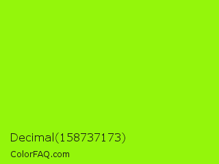 Decimal 158737173 Color is a normal green color and the nearest color is Spring Bud #a7fc00. Hex code #94f60b and RGB value is rgb(148,246,11). In RGB color space, this color is composed of 58% red, 96% green, 4% blue, In CMYK color space, this color is composed of 40% cyan, 0% magenta, 96% yellow , 4% black , In HSL color space, this color has a hue angle of 85° , 93% saturation and 50% lightness.