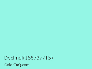 Decimal 158737715 Color is a light cyan color and the nearest color is Water Leaf #a1e9de. Hex code #94f6e5 and RGB value is rgb(148,246,229). In RGB color space, this color is composed of 58% red, 96% green, 90% blue, In CMYK color space, this color is composed of 40% cyan, 0% magenta, 7% yellow , 4% black , In HSL color space, this color has a hue angle of 170° , 84% saturation and 77% lightness.