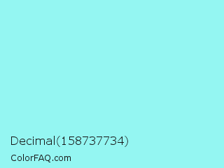 Decimal 158737734 Color is a light cyan color and the nearest color is Waterspout #a4f4f9. Hex code #94f6f2 and RGB value is rgb(148,246,242). In RGB color space, this color is composed of 58% red, 96% green, 95% blue, In CMYK color space, this color is composed of 40% cyan, 0% magenta, 2% yellow , 4% black , In HSL color space, this color has a hue angle of 178° , 84% saturation and 77% lightness.