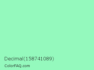 Decimal 158741089 Color is a light green color and the nearest color is Teal Deer #99e6b3. Hex code #94f9bd and RGB value is rgb(148,249,189). In RGB color space, this color is composed of 58% red, 98% green, 74% blue, In CMYK color space, this color is composed of 41% cyan, 0% magenta, 24% yellow , 2% black , In HSL color space, this color has a hue angle of 144° , 89% saturation and 78% lightness.