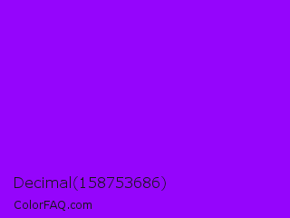 Decimal 158753686 Color is a normal purple color and the nearest color is Electric Violet #8f00ff. Hex code #9505fc and RGB value is rgb(149,5,252). In RGB color space, this color is composed of 58% red, 2% green, 99% blue, In CMYK color space, this color is composed of 41% cyan, 98% magenta, 0% yellow , 1% black , In HSL color space, this color has a hue angle of 275° , 98% saturation and 50% lightness.