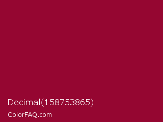 Decimal 158753865 Color is a dark rose color and the nearest color is Pink Raspberry #980036. Hex code #950631 and RGB value is rgb(149,6,49). In RGB color space, this color is composed of 58% red, 2% green, 19% blue, In CMYK color space, this color is composed of 0% cyan, 96% magenta, 67% yellow , 42% black , In HSL color space, this color has a hue angle of 342° , 92% saturation and 30% lightness.