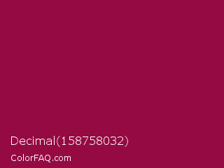 Decimal 158758032 Color is a normal rose color and the nearest color is Pink Raspberry #980036. Hex code #950a42 and RGB value is rgb(149,10,66). In RGB color space, this color is composed of 58% red, 4% green, 26% blue, In CMYK color space, this color is composed of 0% cyan, 93% magenta, 56% yellow , 42% black , In HSL color space, this color has a hue angle of 336° , 87% saturation and 31% lightness.