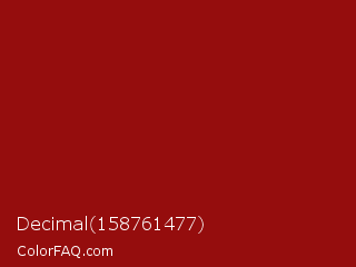 Decimal 158761477 Color is a normal red color and the nearest color is Tamarillo #991613. Hex code #950d0d and RGB value is rgb(149,13,13). In RGB color space, this color is composed of 58% red, 5% green, 5% blue, In CMYK color space, this color is composed of 0% cyan, 91% magenta, 91% yellow , 42% black , In HSL color space, this color has a hue angle of 0° , 84% saturation and 32% lightness.