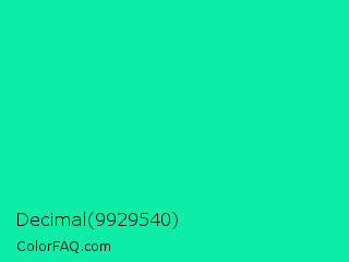 Decimal 9929540 Color is a normal green color and the nearest color is Medium Spring Green #00fa9a. Hex code #0eeda8 and RGB value is rgb(14,237,168). In RGB color space, this color is composed of 5% red, 93% green, 66% blue, In CMYK color space, this color is composed of 94% cyan, 0% magenta, 29% yellow , 7% black , In HSL color space, this color has a hue angle of 161° , 89% saturation and 49% lightness.